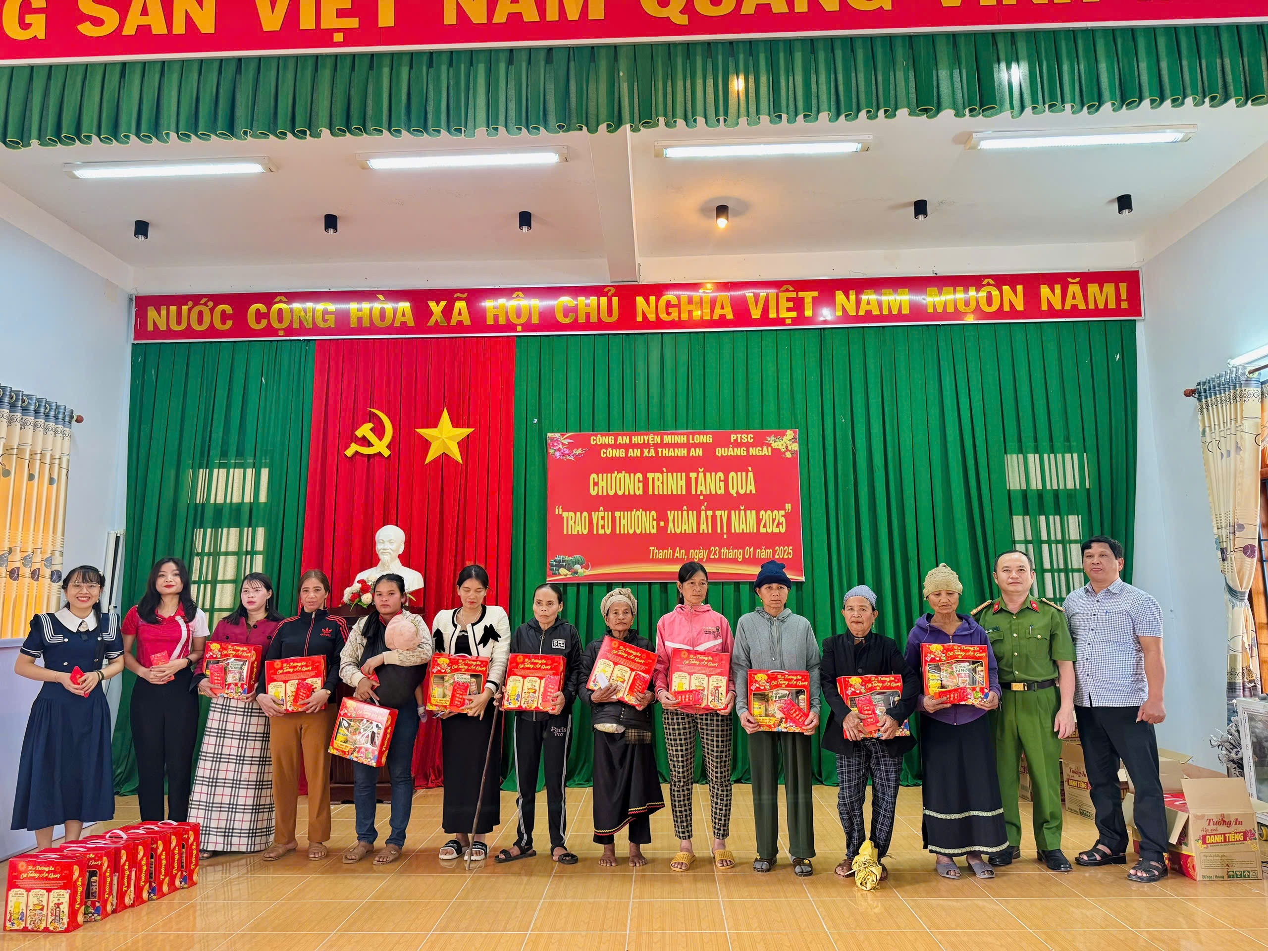Tiếp nối hoạt động an sinh xã hội, chiều ngày 23/01/2025, Công đoàn PTSC Quảng Ngãi phối hợp với Công an xã Thanh An, huyện Minh Long thực hiện chương trình “Trao yêu thương – Xuân Ất Tỵ năm 2025”. Chương trình đã trao tặng các phần quà Tết bao gồm thực phẩm, nhu yếu phẩm thiết yếu trị giá hơn 20.000.000 đồng nhằm giúp đỡ các gia đình khó khăn chuẩn bị đón Tết đầm ấm, đầy đủ hơn và cấp phát hơn 250 bộ quần áo cũ cho bà con nhân dân của Công an xã quyên góp từ các Mạnh thường quân. Những phần quà tuy giá trị không lớn nhưng là tình cảm, sự sẻ chia và là nguồn động viên tinh thần quý báu đối với bà con trong xã. Và cũng trong chương trình này, Công an xã Thanh An, huyện Minh Long đã tổ chức Lễ ra mắt mô hình “Con nuôi Công an xã Chia sẻ yêu thương”. Đây là một chương trình mang ý nghĩa nhân văn sâu sắc, nhằm hỗ trợ, chăm sóc và giúp đỡ các con em có hoàn cảnh khó khăn, mồ côi, không nơi nương tựa trong cộng đồng.