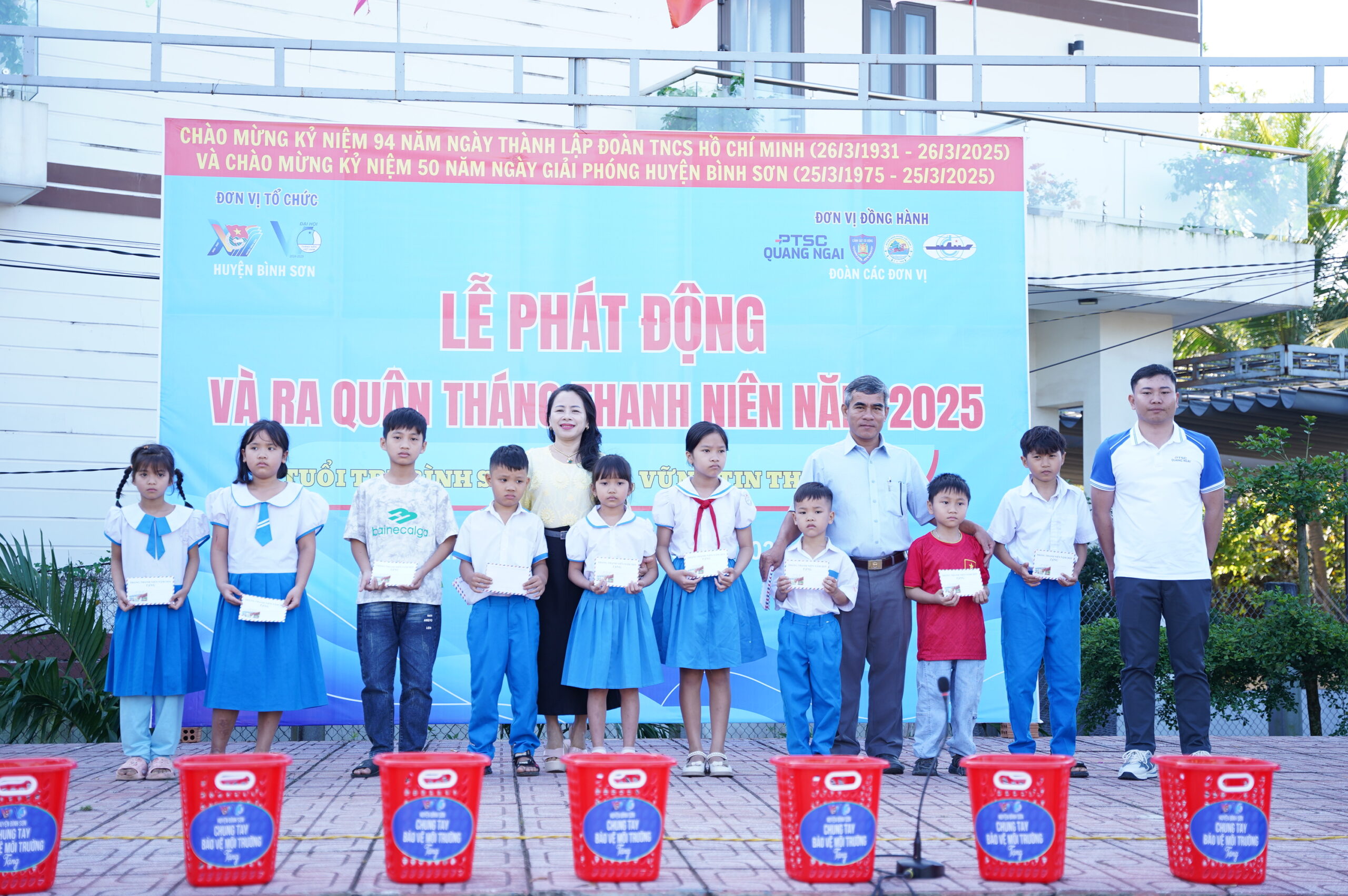 Tại buổi lễ, các ĐTN PTSC Quảng Ngãi cùng các đơn vị đã tiến hành trao tặng 20 suất quà (500.000 VNĐ/suất) cho thanh thiếu nhi có hoàn cảnh khó khăn trên địa bàn xã Bình Thuận. Đồng thời trao tặng 50 giỏ rác cho 50 hộ dân góp phần xây dựng khu dân cư giảm thiểu rác thải nhựa và phân loại rác thải tại nguồn cùng chung tay xây dựng một cộng đồng văn minh, thân thiện với môi trường.