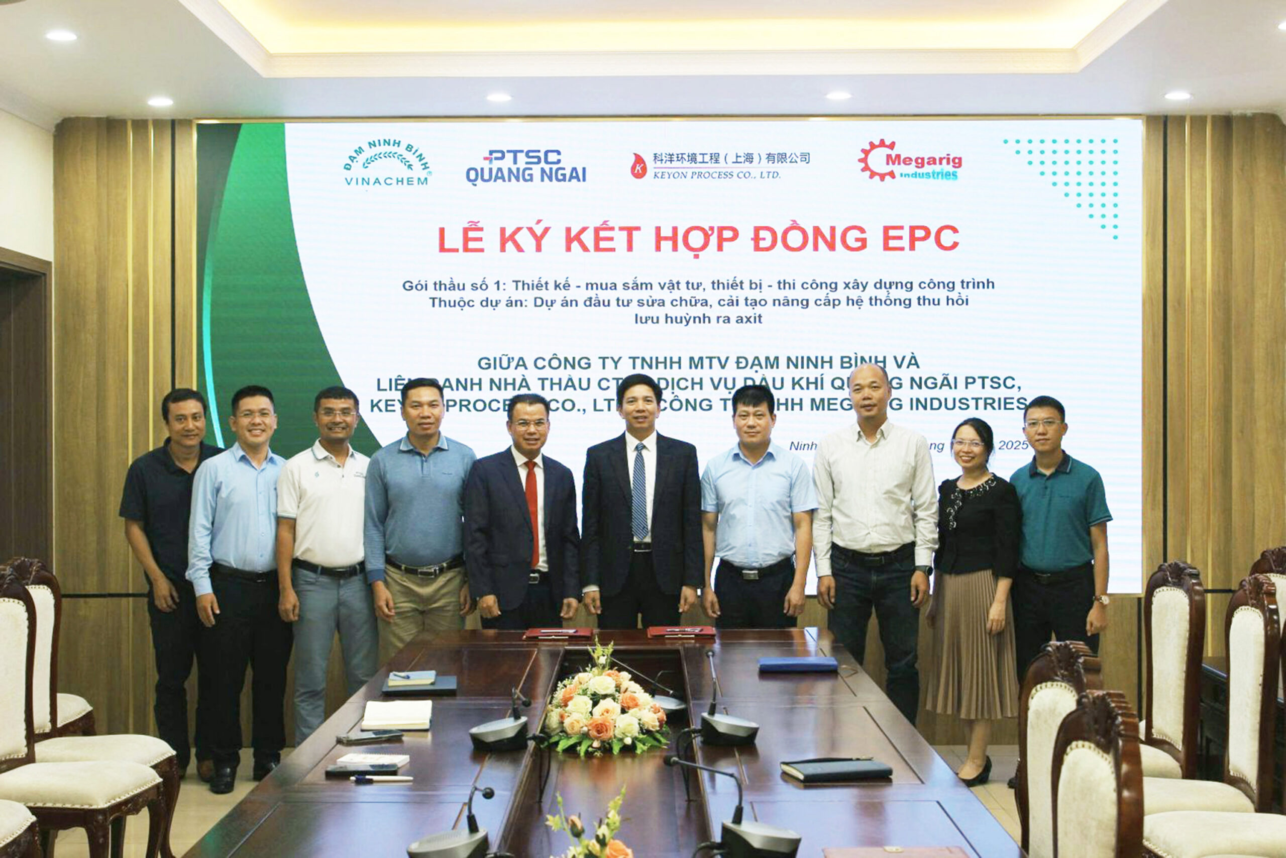 Chiều ngày 01/10 tại tỉnh Ninh Bình, Liên danh Công ty Cổ phần Dịch vụ Dầu khí Quảng Ngãi PTSC (PTSC Quảng Ngãi), Keyon Process Co., Ltd và Công ty TNHH Megarig Industries đã long trọng thực hiện Lễ ký kết Hợp đồng EPC Gói thầu số 1: Thiết kế – Mua sắm vật tư, thiết bị – Thi công xây dựng công trình thuộc Dự án Đầu tư sửa chữa, cải tạo nâng cấp hệ thống thu hồi lưu huỳnh ra axit với Chủ đầu tư – Công ty TNHH MTV Đạm Ninh Bình. Sự kiện này đánh dấu bước khởi đầu cho hợp tác chiến lược giữa Nhà thầu và Chủ đầu tư, đồng thời khẳng định năng lực của Liên danh trong lĩnh vực thiết kế – thi công công trình công nghiệp, đặc biệt là các dự án hóa chất và phân bón.
