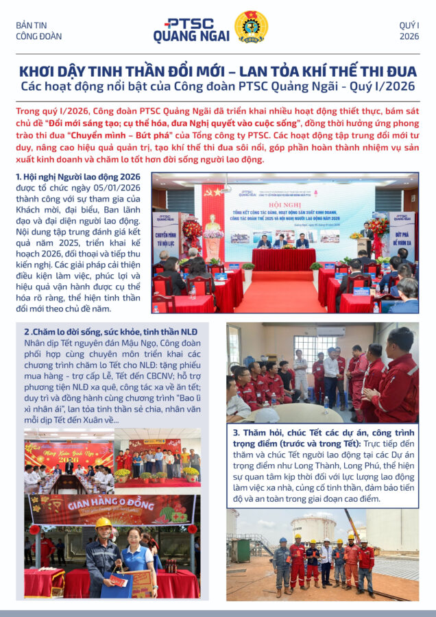 Khép lại quý I/2026 với nhiều dấu ấn, Công đoàn PTSC Quảng Ngãi đã triển khai hiệu quả các hoạt động chăm lo người lao động, từ Hội nghị Người lao động, chương trình Tết ấm áp đến những chuyến thăm hỏi tại công trường, thể hiện rõ vai trò đồng hành và gắn kết. Hãy cùng nhìn lại những khoảnh khắc nổi bật và lan tỏa tinh thần tích cực của đại gia đình PTSC Quảng Ngãi!